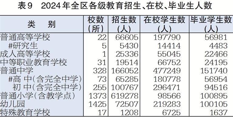 年末全区各级各类学校3197所(含小学教学点356所),教职工127448人。全年全区学前教育毛入园率93.44%,小学学龄人口入学率100%,初中阶段毛入学率111.96%,高中阶段毛入学率94.92%,高等教育毛入学率60.5%,九年义务教育巩固率为100.42%。