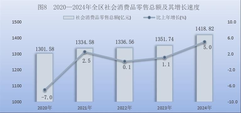 全年全区社会消费品零售总额1418.82亿元,比上年增长5.0%。按经营地统计,城镇消费品零售额1222.12亿元,增长5.3%;乡村消费品零售额196.70亿元,增长2.7%。按消费形态统计,商品零售额1259.76亿元,增长5.4%;餐饮收入额159.06亿元,增长1.6%。