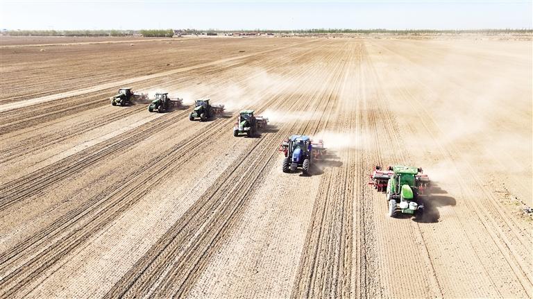 4月24日,在石嘴山市平罗县宁夏农垦前进农场二站片区,6台气吸式玉米精量播种机正在进行春耕作业。 据悉,前进农场今年计划青贮玉米种植面积4万余亩,现已储备各类种子59.4吨,化肥及复合肥3894吨,力争实现农场粮食大面积增产提升。“目前,前进农场春耕工作已进行过半,预计4月底至5月初全面完成春耕工作。”前进农场农业产业公司副经理连卫东说。 本报记者 李涛 马赛尔 摄
