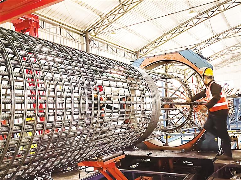 4月24日,在国道629线中卫至下小河段改扩建工程项目现场,工人正在制作钢筋笼。 本报记者 赵磊 摄