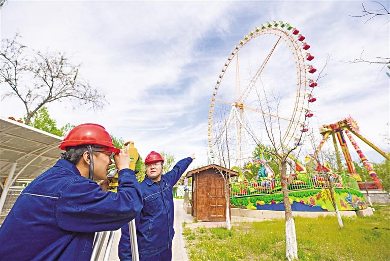 4月27日,宁夏特种设备检验检测研究院检验人员在对银川阅海欢乐岛的大型游乐设施进行定期检验。为确保“五一”假期大型游乐设施安全运行,连日来,自治区市场监管厅宁夏特种设备检验检测研究院对银川阅海欢乐岛、森林公园、中山公园、览山公园等地的大型游乐设施展开全面定期检验。 本报记者 马楠 王洋 摄