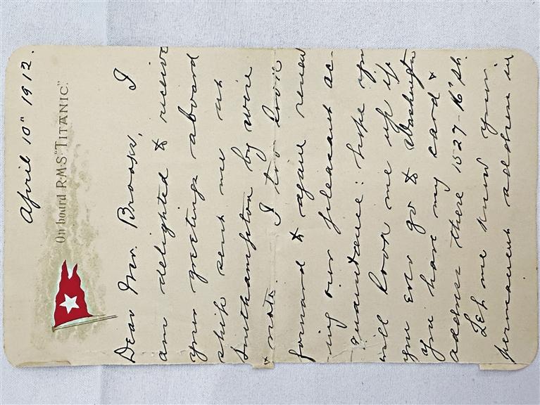 据英国《卫报》报道,“泰坦尼克”号头等舱乘客阿奇博尔德·格雷西1912年4月10日在英国登船时写下这封信,寄给好友,收信地址为英国伦敦一家酒店。这艘船经停爱尔兰,因此信上有爱尔兰昆斯敦4月11日邮戳以及英国伦敦4月12日邮戳。