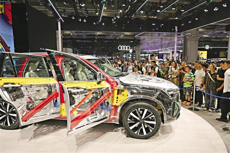 5月1日,参观者在一辆车身材料透明的沃尔沃XC90展车前驻足观看。当日是“五一”假期第一天,正在国家会展中心(上海)举行的第二十一届上海国际汽车工业展览会(2025上海车展)迎来众多参观者。 新华社发