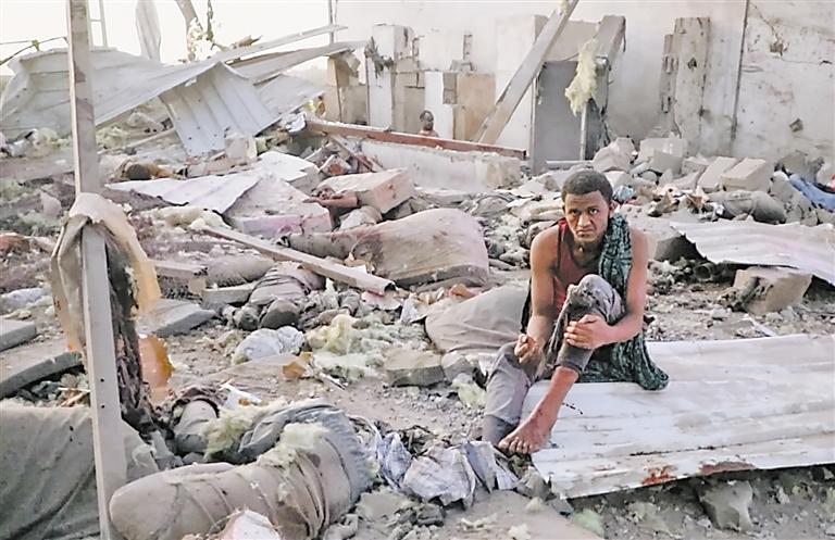 这张4月28日拍摄的视频截图显示,在也门萨达省一个拘留中心,伤者在废墟中等待救援。 新华社发
