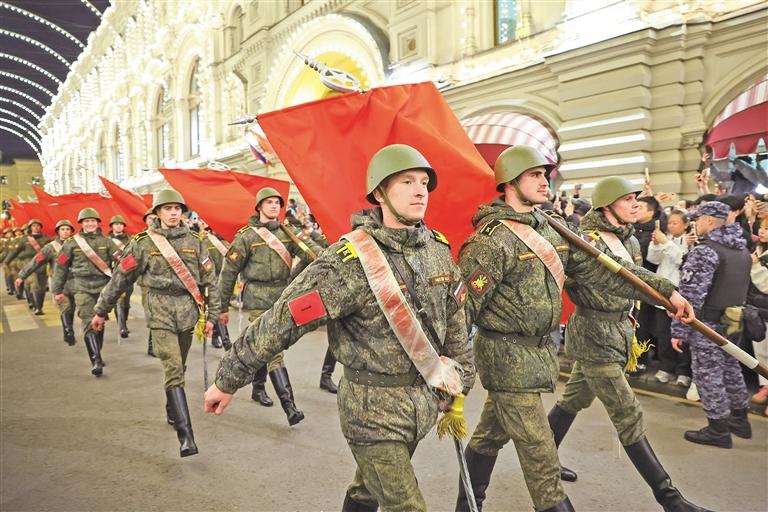 5月3日晚,受阅方队在俄罗斯首都莫斯科前往红场参加彩排。当日,俄罗斯纪念卫国战争胜利80周年阅兵式彩排在莫斯科举行。 新华社发