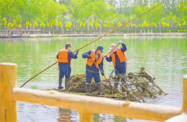 5月6日,工人在银川市典农河清理水草。初夏时节,典农河进入水草生长旺盛期,银川市水务部门制定动态化清淤方案,通过分河段、分时段修剪打捞,精准调控水草密度,既保障河湖生态功能,又维护水体清澈。 本报记者 马楠 王洋 摄