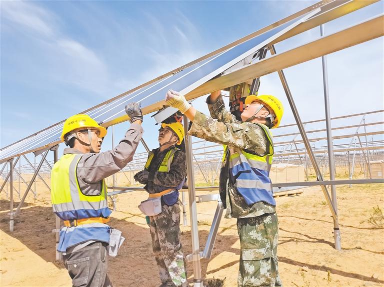 5月5日,中铁十六局集团有限公司宁国运盐池92万千瓦光伏复合项目工地上,建设者们正在安装光伏支架和光伏组件。该项目以每日完成1600套支架的速度,向6月30日并网通电目标冲刺。 本报记者 白茹 摄