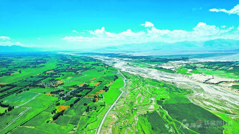 俯瞰乌什县托什干河国家湿地公园美景(6月23日无人机摄)。夏日的乌什县托什干河国家湿地公园,绿意葱茏、生机盎然。蜿蜒的河流、丰茂的湿地与两岸的田野、群山绘出一幅生态和谐的美丽画卷。 □王举南摄
