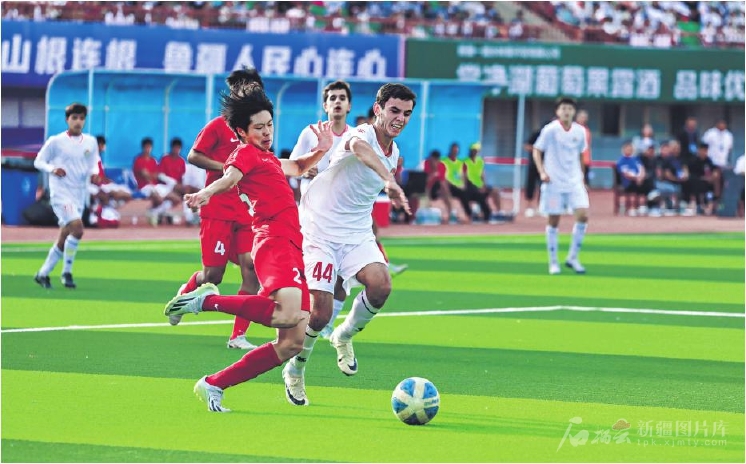6月30日晚,中国广东梅州客家足球俱乐部队(红)和塔吉克斯坦足球学院队(白)队员在比赛中拼抢。□阿孜古丽·艾达力摄