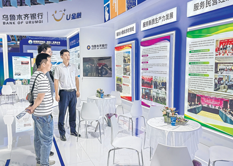 6月28日,乌鲁木齐银行工作人员在展厅向客商推介金融服务和产品。□李歌摄