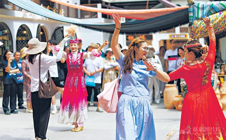 6月30日,游客与演员一起跳舞。夏日的新疆国际大巴扎景区热闹非凡,游客纷纷来此游玩、购物、拍照打卡。 □孙振嵩摄