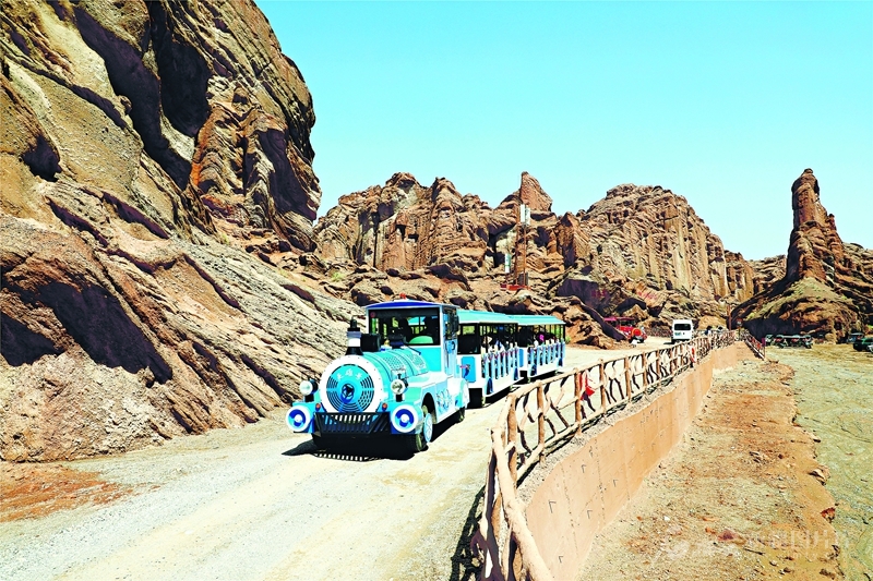 6月30日,游客乘坐观光小火车游览库车市克孜利亚景区。独库公路开通后,八方游客来到库车市各大景区赏美景品民俗。 □吐尔松·托胡提摄