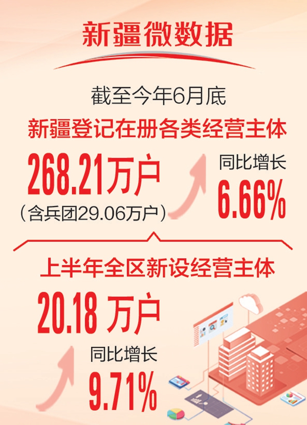 本报乌鲁木齐7月4日讯 石榴云/新疆日报记者索蓉芝从自治区市场监督管理局获悉:截至今年6月底,新疆登记在册各类经营主体共计268.21万户(含兵团29.06万户),同比增长6.66%。上半年,全区新设经营主体20.18万户,同比增长9.71%,整体呈现良好发展态势。