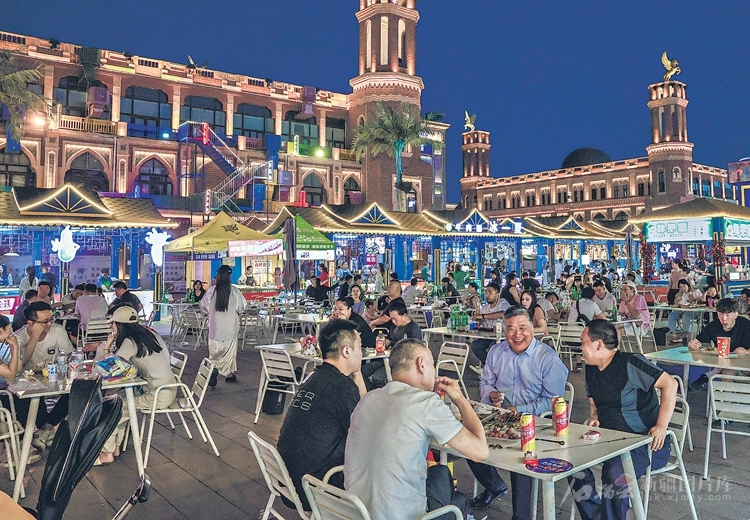 7月4日,伊宁市丝路之光旅游小镇夜市霓虹闪烁、美食飘香。市民和游客品尝美味佳肴,欢声笑语不断。□张庆华摄