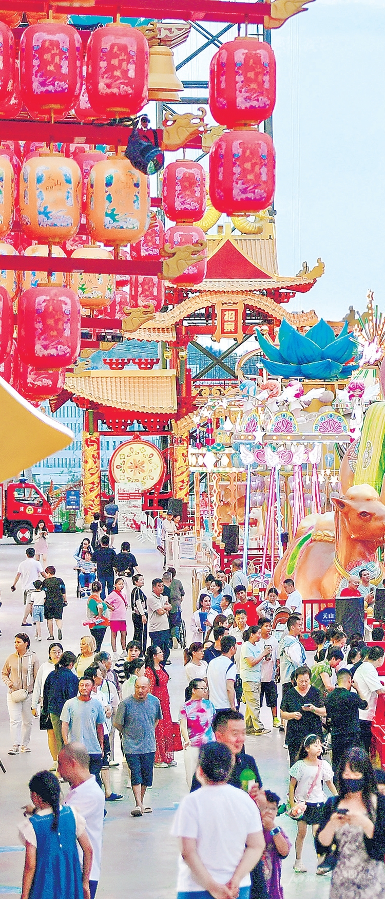 7月3日傍晚,乌鲁木齐市水磨沟区天山明月城流光溢彩、游人如织。□石榴云/新疆日报记者邹懿摄