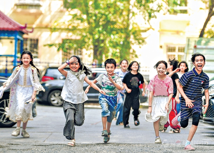 7月4日,乌鲁木齐市天山区二道桥街道固原巷社区的小朋友们在一起玩耍。□石榴云/新疆日报记者邹懿摄