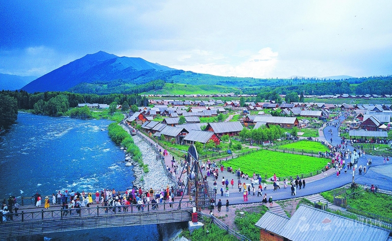 7月5日,游客在布尔津县禾木景区游玩(无人机摄)。夏日的禾木景区清凉宜人,景色如画,游客纷至沓来。 □阿尔达克·拜斯汗摄
