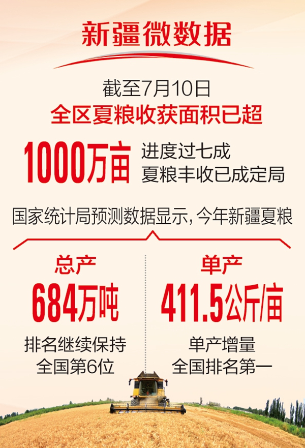 本报乌鲁木齐7月14日讯 石榴云/新疆日报记者刘毅从自治区农业农村厅获悉:新疆各地不误农时推进夏粮收获各项工作,截至7月10日,全区夏粮收获面积已超1000万亩,进度过七成,夏粮丰收已成定局。