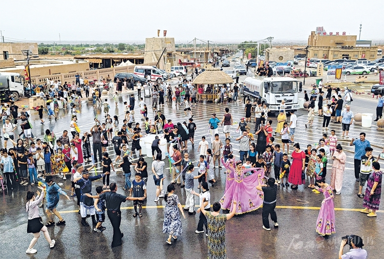 7月6日,在火焰山下的吐峪沟景区,游客参加泼水狂欢活动。连日来,吐鲁番持续出现高温天气,该景区举办了泼水狂欢活动,吸引众多游客参与。 □刘健摄