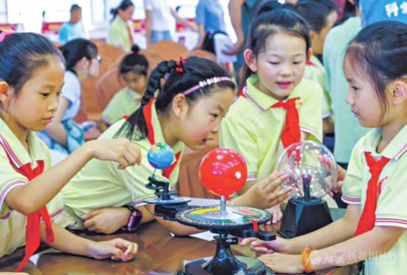 7月5日,在乌鲁木齐经济技术开发区(头屯河区)嵩山街街道西湖社区,一群孩子围着老师,体验科学实验的魅力。