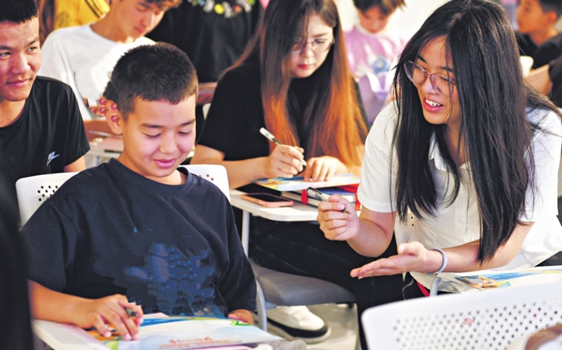 7月14日,返乡大学生鼓励小朋友写下自己的梦想。当日,库尔勒市举办“梦想合伙人”返乡大学生与中小学生结对赋能活动。该市7所学校的60余名中小学生与返乡大学生互动交流,播下奋斗的种子。□石榴云/新疆日报记者 王立华摄