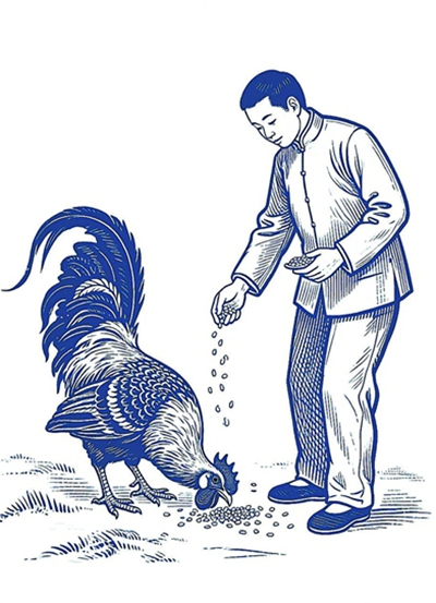 只见它昂首走在前,两只雌野鸡跟随在身后。它在前面看到地上有食物,就发出嘎嘎嘎的叫声,两只雌野鸡飞快地跑到它身边,一口一口地啄起食来,而它,站在一旁高傲地扬着头,似乎有种幸福与满足的感觉。