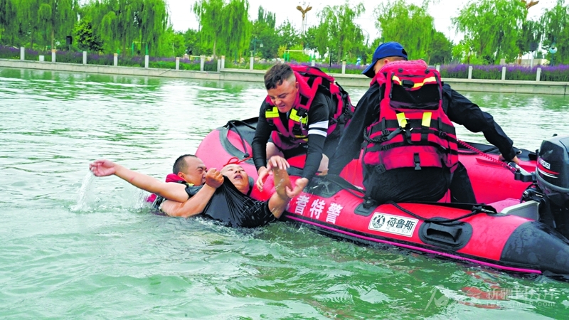 眼下正值“七下八上”防汛关键期,我区各地各部门扎实做好防汛抗旱、应急救援各项工作。图为7月11日,焉耆回族自治县公安局特警大队民警辅警开展模拟水上救援场景演练,利用绳索展开救援。□马璐莎摄