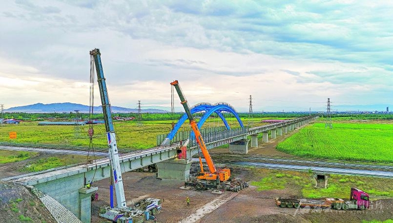 近日,在中铁十五局集团塔城交投国际物流园铁路专用线项目喀拉苏村特大桥施工现场,工人在架设桥梁。随着该桥梁的架设完工,全线桥梁架设任务完成。 □杨文摄