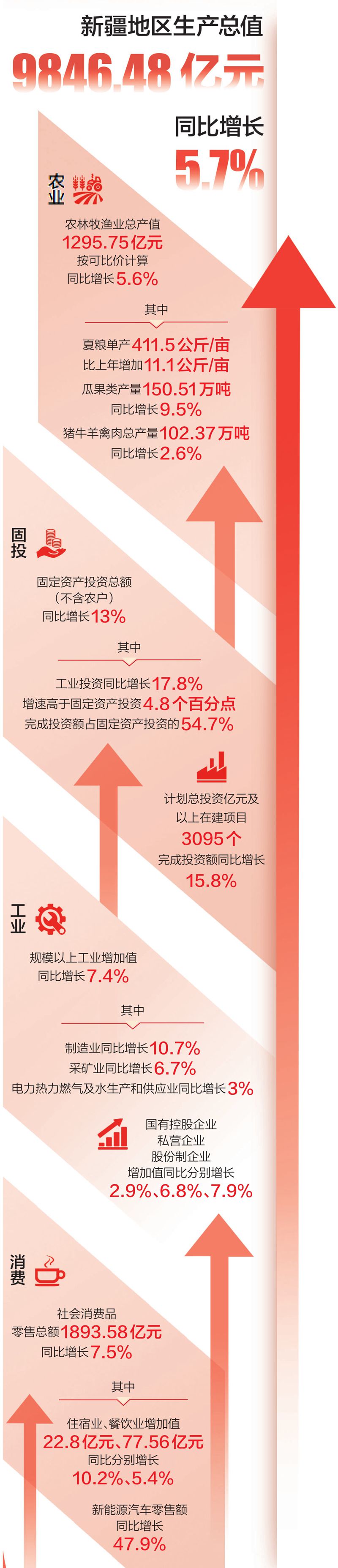 7月24日,上半年新疆经济答卷出炉:根据地区生产总值统一核算结果,上半年,新疆地区生产总值9846.48亿元,按不变价格计算,同比增长5.7%。