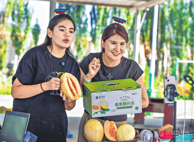 7月22日,在库车市乌恰镇吐孜鲁克墩村,工作人员直播销售“甬甜5号”甜瓜。