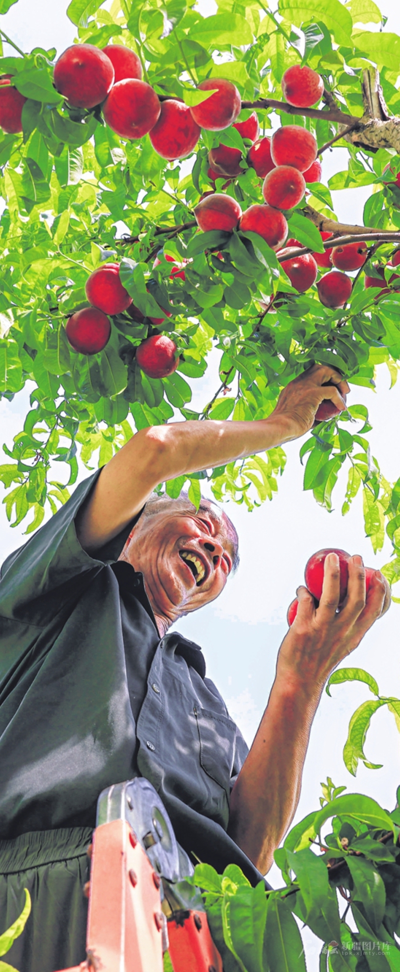 7月15日,新源县新源镇恰普河阿吾孜村村民采摘成熟的桃子,脸上满是丰收的喜悦。□张文庭摄