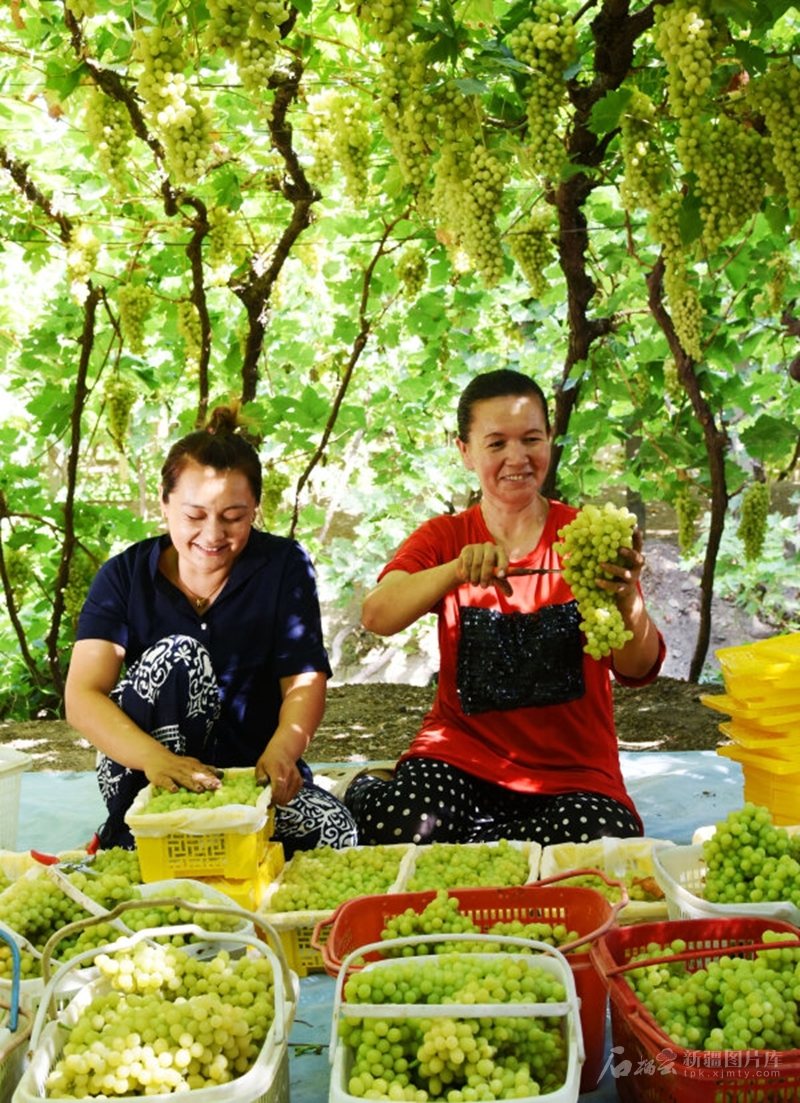 7月16日,果农在吐鲁番市高昌区葡萄镇巴格日社区葡萄种植基地分选葡萄。眼下,吐鲁番市63.28万亩葡萄进入采摘季,果农正忙着采摘、装箱上市销售。□刘健摄