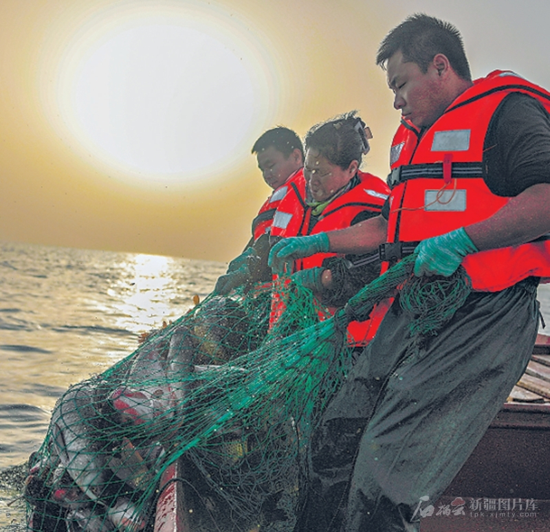 7月24日,渔民在博斯腾湖开展捕鱼作业,现场呈现一派鱼跃人欢的丰收景象。 □胡倚琦摄