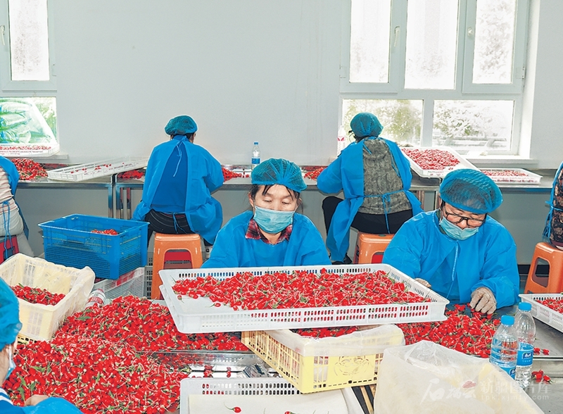 7月20日,精河县托里镇吾夏克巴依西村枸杞加工厂内,工人在分拣枸杞鲜果。目前,精河县枸杞种植面积达10.31万亩,年产鲜果近6万吨。□赛永杰摄