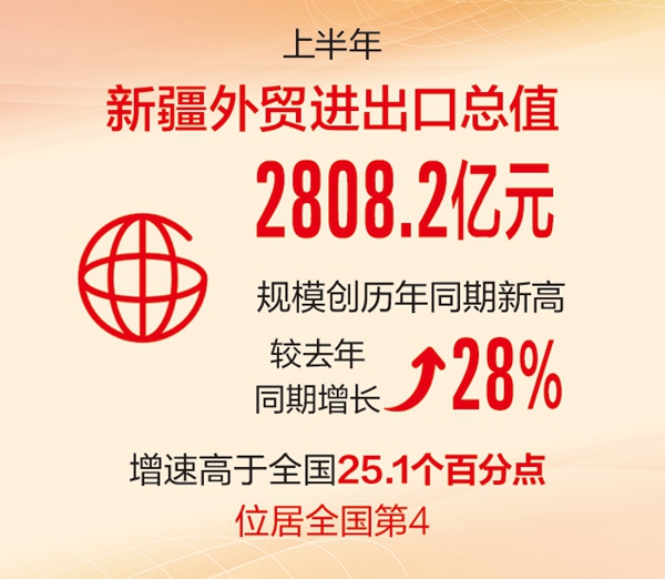 本报乌鲁木齐7月25日讯 石榴云/新疆日报记者陈蔷薇报道:上半年,新疆外贸进出口总值2808.2亿元,规模创历年同期新高,较去年同期增长28%;增速高于全国25.1个百分点,位居全国第4。这是记者从自治区人民政府新闻办公室举行的乌鲁木齐海关助力新疆外贸高质量发展新闻发布会上获悉的。