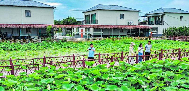 近日,游客在博乐市贝林哈日莫墩乡决肯村观赏荷花。近年来,决肯村深挖乡村旅游潜力,打造连片荷花池等景观,融合民俗文化体验、农耕研学等项目,引得游客纷至沓来。 □石榴云/新疆日报记者蔡增乐摄