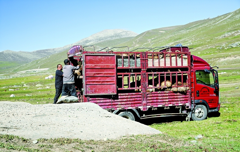 7月23日,在阿勒泰市乌希里克夏牧场,牧民和商贩将羊装上运输车。