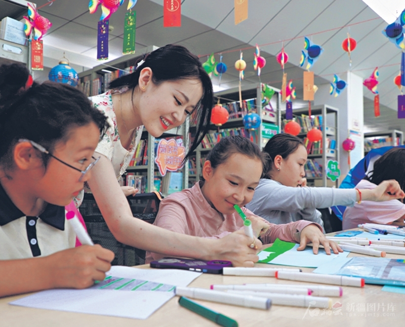 7月28日,党员志愿者在指导学生绘画。暑假期间,阿合奇县阿合奇镇友谊路社区开设“红领巾”小课堂,为辖区学生营造一个安全、快乐的假期环境。□徐刚摄
