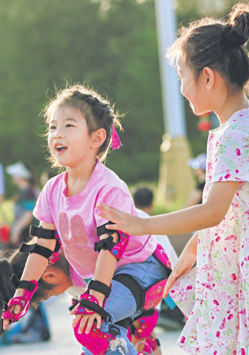 7月29日,小朋友在乌鲁木齐南湖市民广场学轮滑。暑假期间,很多小朋友积极学习轮滑技巧,锻炼身体,磨炼意志。□石榴云/新疆日报记者 蔡增乐摄