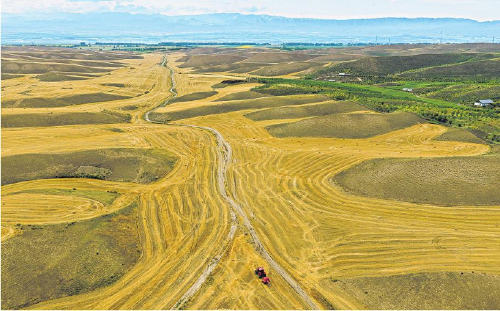 这是在新疆伊犁特克斯县乔拉克铁热克镇拍摄的麦田(7月31日无人机摄)。近日,在位于天山北麓的特克斯县,成熟的小麦迎来收获。当地农民抢抓有利天气,开展夏收工作。□新华社记者辛悦卫摄