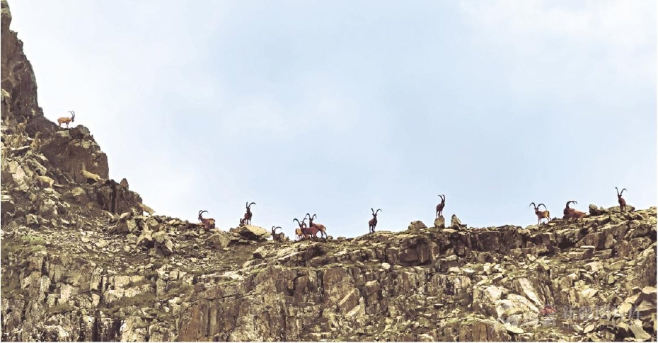 昭苏县察汗乌苏蒙古族乡境内的骆驼峰,一群北山羊正在悬崖峭壁上觅食(7月20日无人机摄)。随着昭苏县生态保护工作的深入推进,北山羊等野生动物频繁出现在人们的视野中。 □巴特那生摄