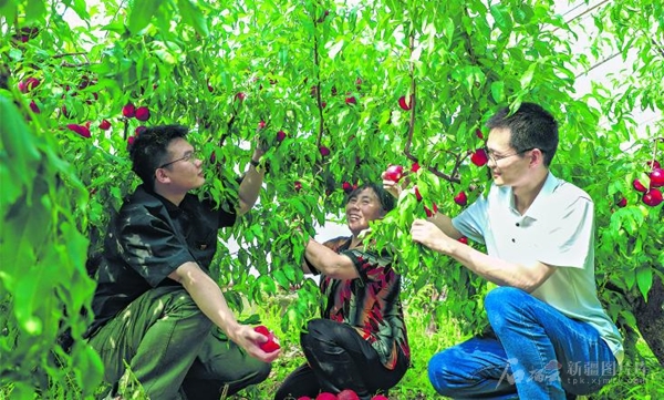 7月28日,在阿合奇县库兰萨日克乡别迭里村蔬果种植基地,党员干部帮助农户采摘油桃。连日来,阿合奇县积极组织党员干部开展志愿服务,助力农户增收。 □古丽加马力·艾萨摄
