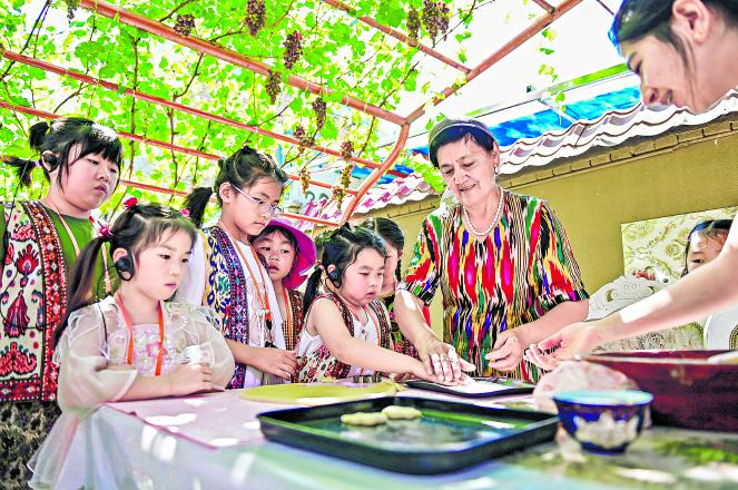 小朋友在伊宁市伊犁老城喀赞其民俗旅游区学做当地特色糕点(7月23日摄)。