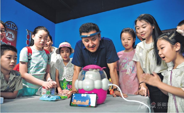 7月31日,乌鲁木齐市水磨沟区六道湾街道科普体验室揭牌,居民在家门口就能体验多种科普仪器,探索科学奥秘。图为居民体验脑机接口技术。□石榴云/新疆日报记者秦梅花摄