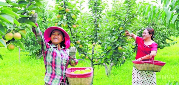 8月5日,阿瓦提县巴格托格拉克乡卡尔库杰克村村民在梨园采摘香梨。眼下,阿瓦提县种植的2.7万亩香梨陆续成熟,果农抢抓农时进行采摘,田间地头呈现出一派繁忙景象。 □包良廷摄