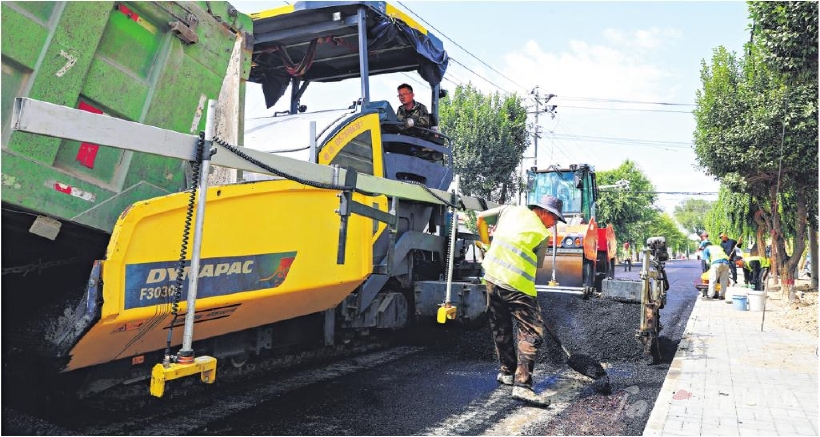 8月5日,施工人员在裕民县哈拉布拉乡南哈拉布拉村道路进行摊铺作业。今年,根据部分村庄道路老化的实际,裕民县计划对5个乡镇17个行政村的25条老旧道路进行提升改造,进一步改善群众出行条件。 □范春海摄
