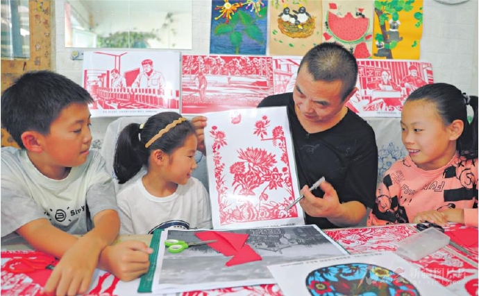 8月6日,在裕民县吉也克镇吉也克村,剪纸艺人晁岳文指导孩子们创作剪纸作品。 □范春海摄