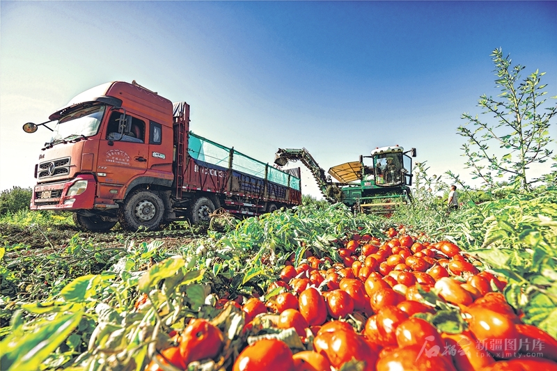 8月7日,番茄收获机在呼图壁县二十里店镇十四户村采收番茄。进入8月,该县2.16万亩加工番茄陆续成熟,当地抢抓农时,有序开展机械化采收作业。 □何龙摄