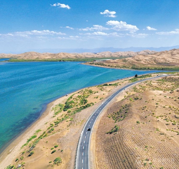 金沙碧波,美丽奇绝(8月8日无人机摄)。长达239.2公里的环博斯腾湖公路,将大河口、莲海世界、白鹭洲、月牙湾、金沙滩等景区景点一一串联,吸引各地游客纷至沓来。 □年磊摄