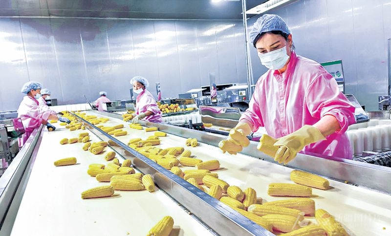 8月11日,在位于察布查尔锡伯自治县伊南工业园区的伊犁天一农业有限公司生产车间,工人在自动化输送系统前分拣鲜食玉米。